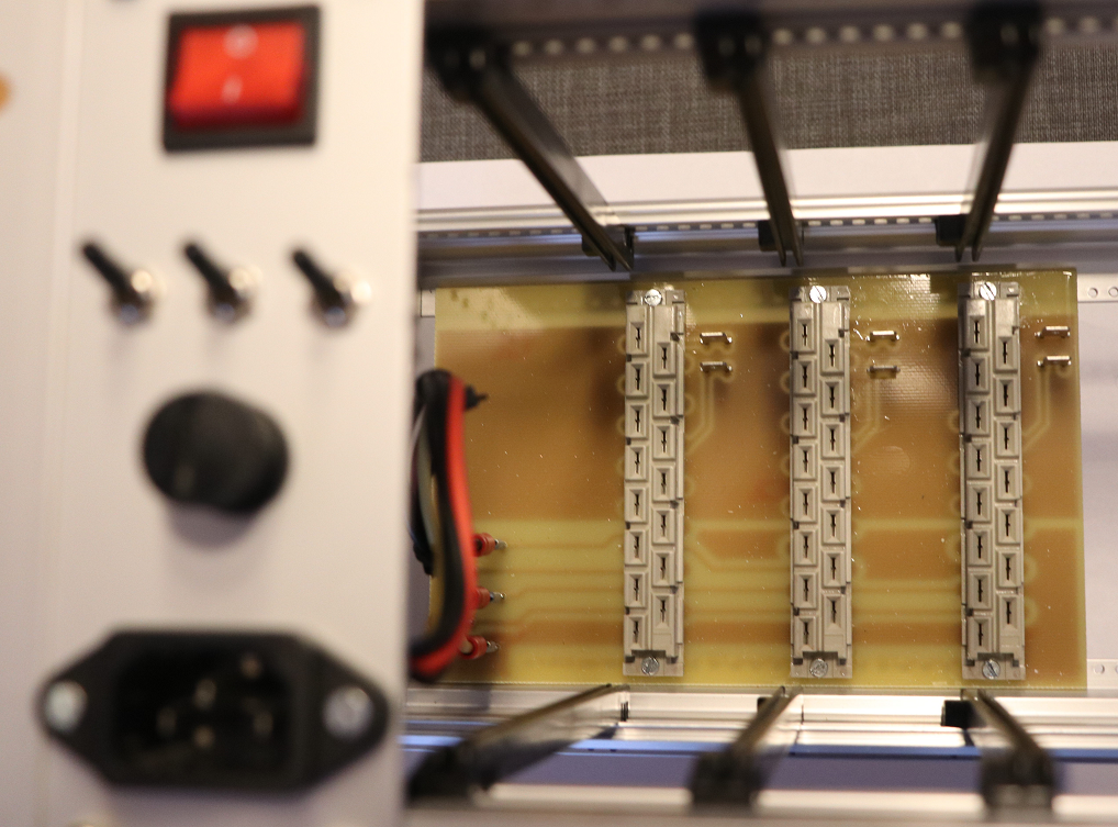 Abgangsseitig habe ich auf der Frontplatte für jeden Strang noch eine Sicherung (500 mA träge eingebaut). Das Netzteil sitzt auf